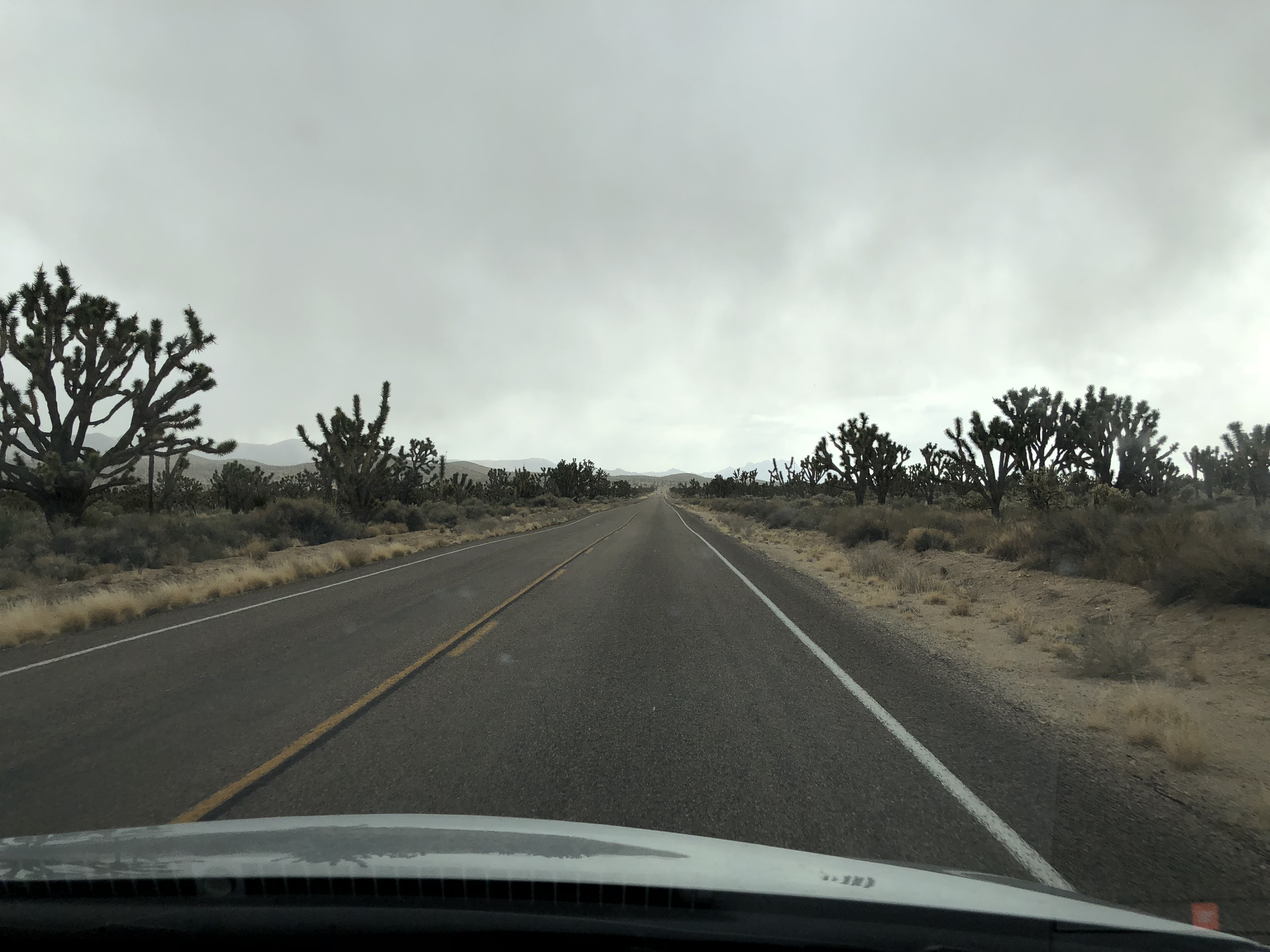 There was an hour-long backup near the California border at Primm, so after suffering through that we noted a similar backup on I-15 before LA and decided to take the back route through the Mohave reserve to Yucca Valley and home since the GPS said it would save over an hour; normally we wouldn’t because of the risk of having no cell service or road assistance in most of the area. But it was lovely and quiet as he storm hit and snow began to fall amongst the cactus and Joshua trees.